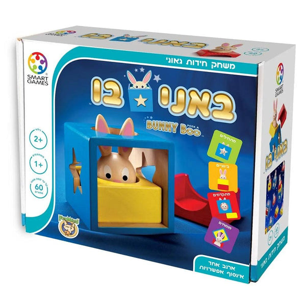 הוציאו ארנב מהקופסא! באני-בו הוא משחק תלת-מימדי לקטנטנים, המכיל 4 חלקי עץ גדולים. האם הארנבון מציץ דרך החור העגול, או אולי דרך הכוכב? האם הוא עומד מעל החלק הצהוב, האדום...