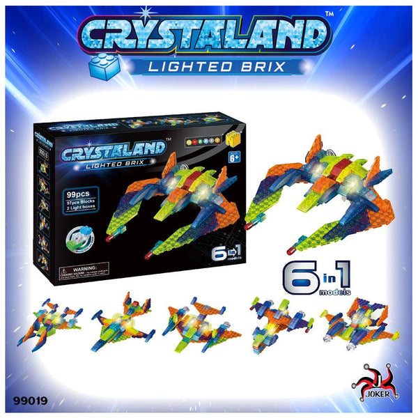 סט הרכבת חללית 99 חלקים אורות 6 ב - 1 מבית CRYSTALAND.  הערכה מכילה 99 חלקי הרכבה (98 חלקי קוביות וחולק מואר אחד).  לגילאי 6 ומעלה. האירו את משחק ההרכבה שלכם עם סט לבנים יציבות...