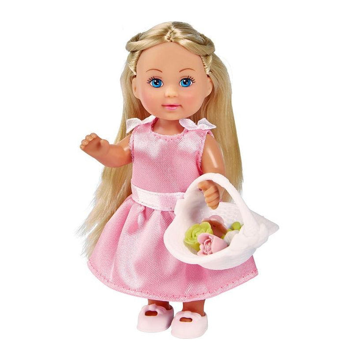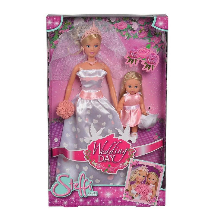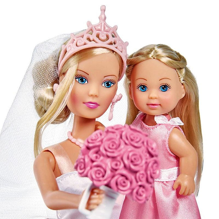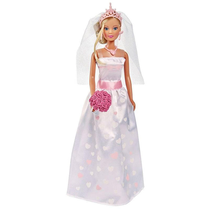 בובת סטפי יום חתונה סטפי כלה בשמלה יפה במיוחד עם זר פרחים וילדה עם סלסלה . גובה כ-29 ס"מ. לגילאי 3 ומעלה.