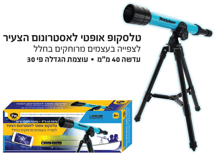 טלסקופ אופטי לאסטרונום הצעיר לצפייה בעצמים מרוחקים בחלל עדשה 40 מ"מ עוצמת הגדלה פי 30לגילאי 8 ומעלה