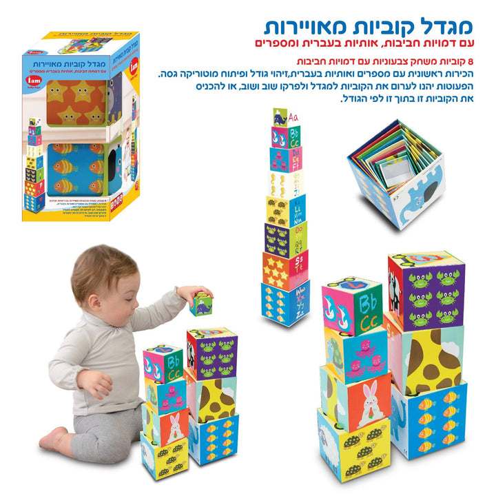 מגדל קוביות מאויירות עם דמויות חביבות אותיות בכברית ומספרים 8 קוביות משחק צבעוניות עם דמויות חביבותהכירות ראשונית עם מספרים ואותיות בעברית זיהוי גודל ופחתוח מוטריקה הפעוטות יהנו לערום את הקוביות למגדל אחד גדול ולפרקו שוב ושוב או להכינס את הקוביות זו בתוך זו לפי הגודל לגילאי 6 חודשים ומעלה.