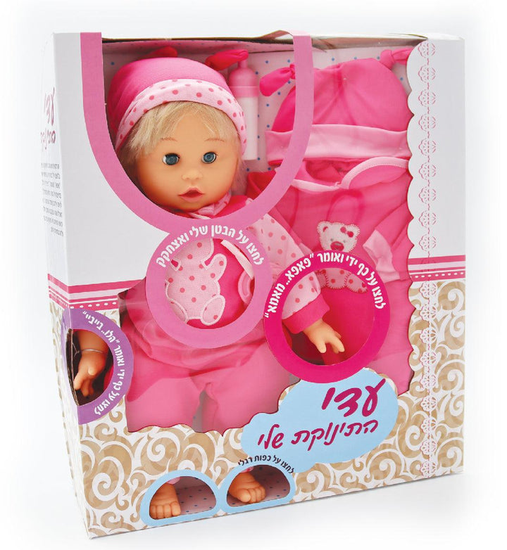 עדי התינוקת שלי עם סט לבושבובה פוקחת ועוצמת עיניה,עם אביזרי האכלה שונים וחליפת בגדים להחלפה.לחיצה על כפות ידיה ורגליה תרגרום לה לדבר לחצו על בטנה ותשמיע צחקוקלעידוד משחק תפקידים ופיתוח דמיון לגילאי 3 ומעלה.