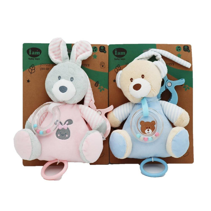 צעצוע רך לעגלה בדמות דובי או ארנה עם קליפס לתליה בעגלה או בלול, רעשן חרוזים צבעוניים מרתק, וטבעת משיכה להשמעת מנגינות נעימות.