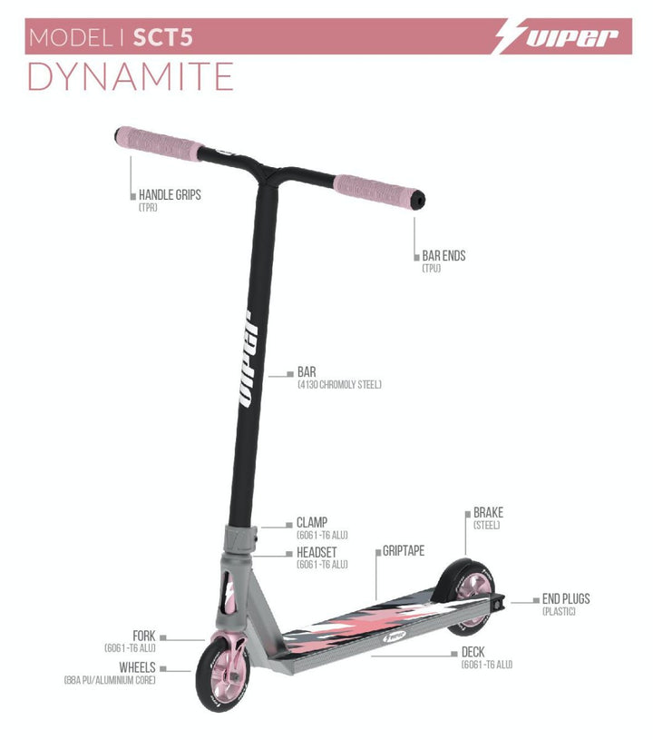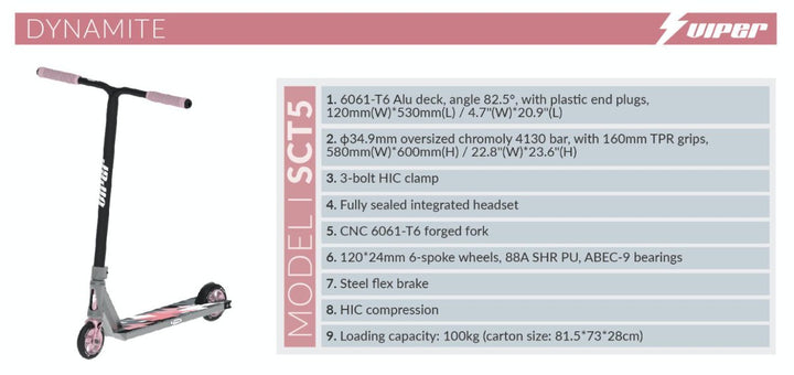 קורקינט פעלולים מקצועי Dynamite viper • סוג חומר קורקינט: אלומיניום• סוג גלגל: סיליקון בגודל 120 מ"מ• האם מתקפל: לא, אחריי שמרכיבים לא ניתן לקפל.• מומלץ לגילאי: 14+• משקל נשיאה: עד 100 ק”ג• כולל משטח נגד החלקה• כולל בלם דריכה אחורי
