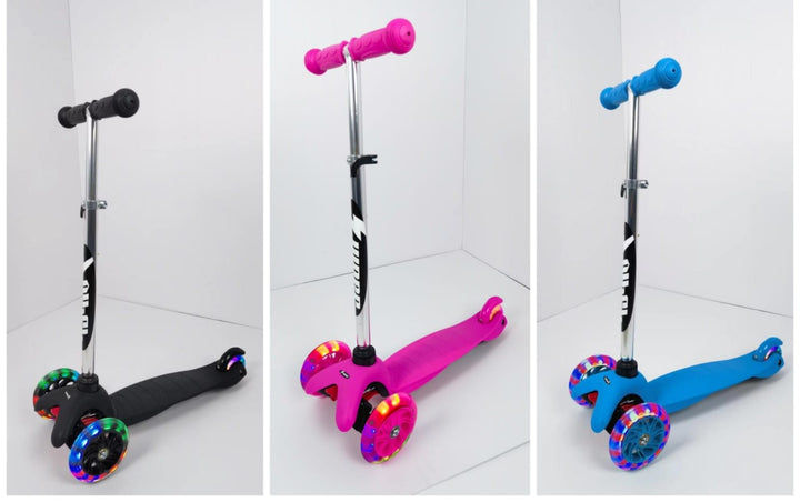 קורקינט בתצורת שלושה גלגלים כולל אורות בגללים .