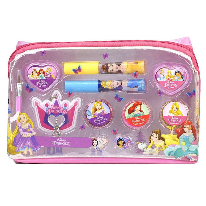 תיק איפור בסגנון נסיכות דיסני האהובות, מכיל גלוסים ואבקות זוהרות.