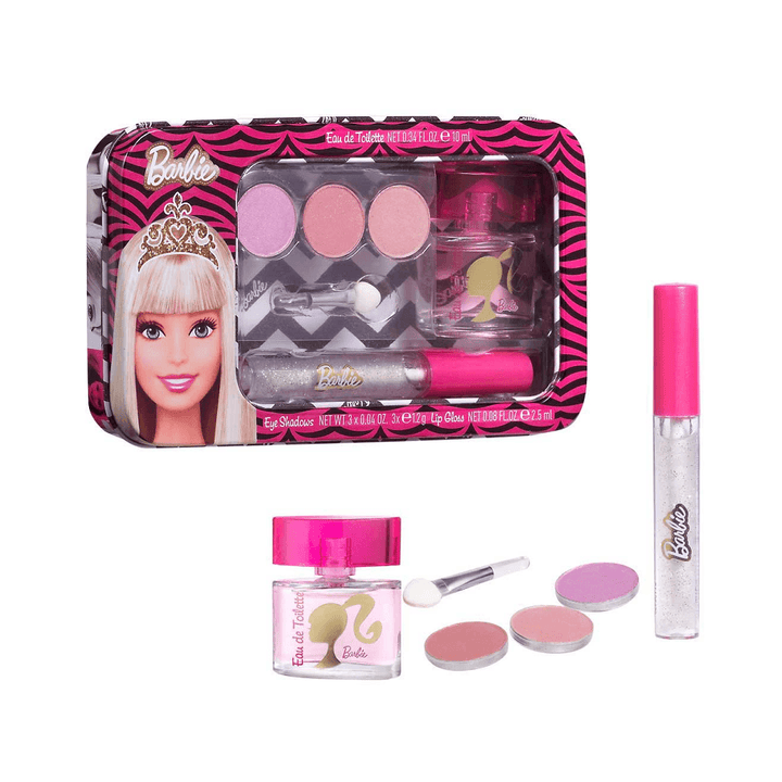 סט טיפוח ברבי מאושר על ידי משרד הבריאות הסט כולל בושם 10 מ"ל, צלליות, מברשת איפור וליפ גלוסמומלץ תחת פיקוח מבוגר.אינו מיועד לגיל 3 ומטה
