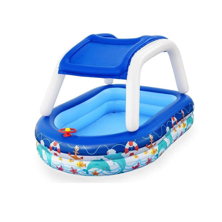 בריכת ספינת הקפיטן עם צלון 213 ס"מ - BestWay בריכת ספינת הקפיטן עם צלון מתנפחת בגודל של כ-213X155X132 ס"מ לגילאי 3 שנים ומעלה. השימוש במוצר בהשגחת מבוגר בלבד!