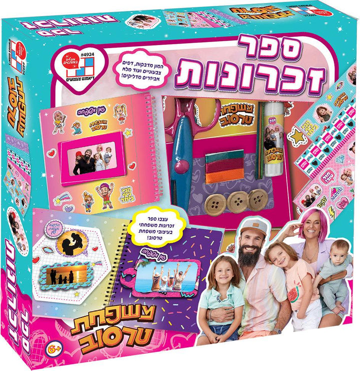 עצבו ספר זכרונות משפחתי בעיצובי משפחת טרסוב! מה בערכה: ספר זכרונות ענק משפחת טרסוב בכריכה קשה, דפים מעוצבים, דפי מדבקות של אותיות בעברית, דפי מדבקות של משפחת טרסוב, דבק, מסגרות נייר, סרטים צבעוניים, חוטים צבעוניים, מקלות ארטיק צבעוניים, כפתורים, עפרונות צבעוניים, מספריים, הוראות לגילאי 6 ומעלה