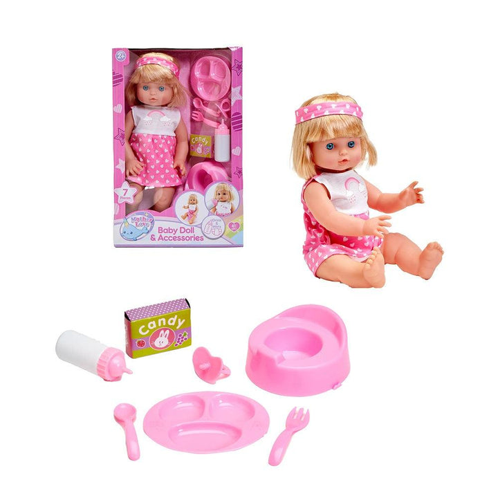 הבובה מגיעה עם מוצץ, סיר, סרט לראש, בקבוק חלב, מזלג, כפית, צלחת, חטיף