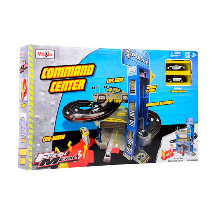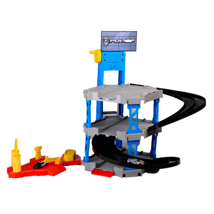 התחרו אל תחתית החניון להצלת העיר עם ערכת המרכז הפיקודי של המשטרה! שלוש קומות ומעלית עובדת ששולחת את כלי הרכב הכלולים בערכה. כולל 2 רכבי מתכת תואמים גודל החניון כ:85X70X58 ס"מ לגילאי 3 ומעלה
