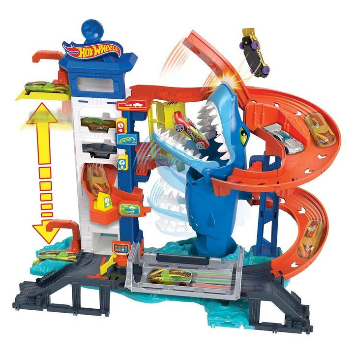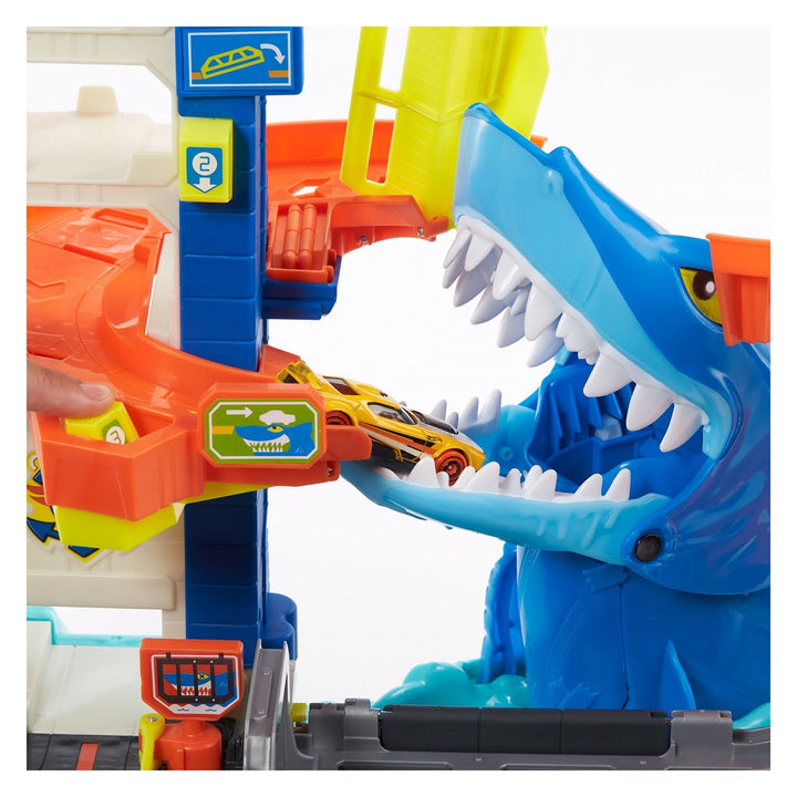 סעו דרך חניון הוט ווילס סיטי, אך היזהרו מהכריש המסוכן שתוקף וזולל כלי רכב תמימים! לסט המשחקים שלוש נקודות הפעלה שמפעילות את הכריש באופן אקראי לפרוץ את המסלול ולאכול את המכונית. בצע את הסיום כדי לנעול את הכריש בכלוב ולאחר מכן לשחרר את המכוניות הלכודות. כולל רכב הוט ווילס, אבל...