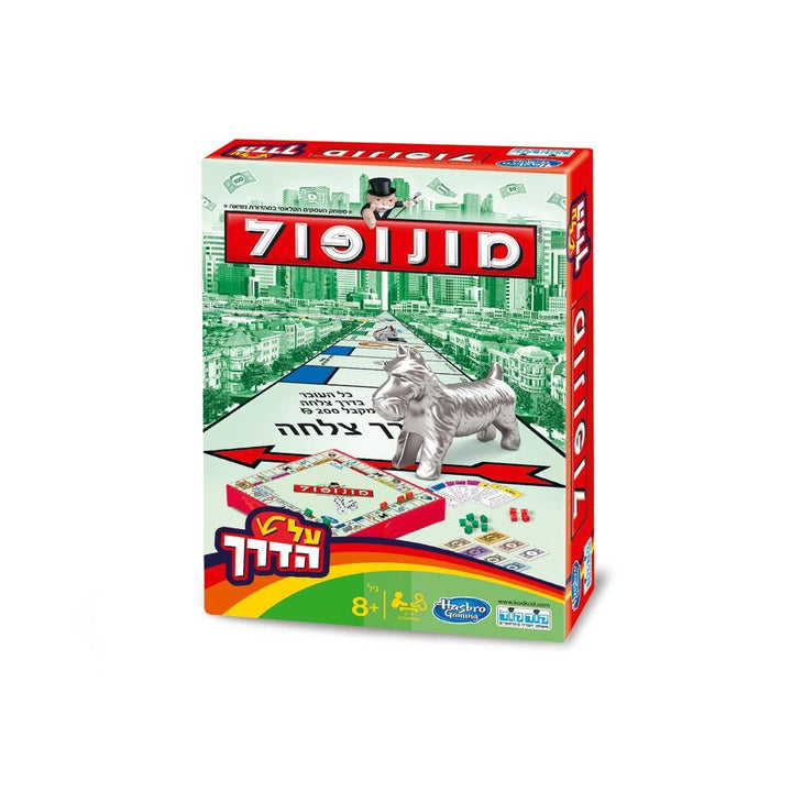 לוח משחק, מדבקת לוח משחק, קלפי משחק (קניין, הפתעה ותיבת מזל) 6 כלי משחק מפלסטיק, 6 מפתחות מפלסטיק, חפיסת שטרות כסף מונופול, 3 קוביות משחק, 32 בתים מפלסטיק, 12 בתי מלון מפלסטיק, הוראות משחק מפורטות.