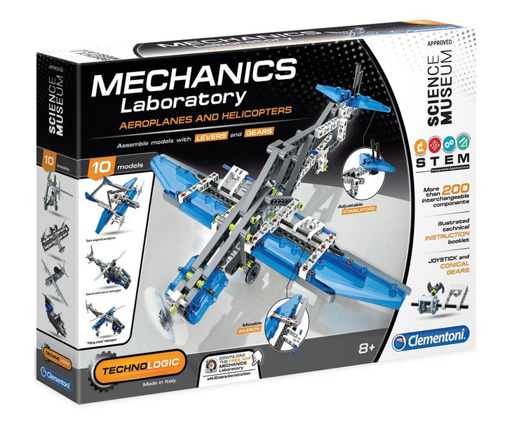 מעבדה מכנית מטוס. ערכת הרכבה מרהיבה בעלת יותר מ-200 חלקים שונים בעזרתם ניתן לבנות 10 דגמי הרכבה שונים! מוצר איכותי תוצרת Clementoni איטליה. לגילאי 8 ומעלה.