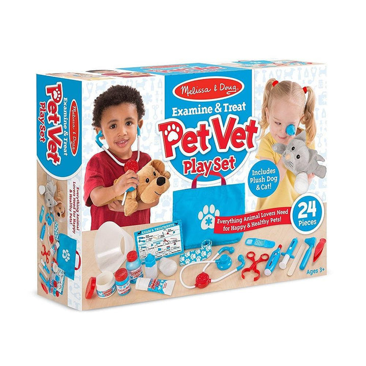ערכת ווטרינר מליסה ודאג. תנו לאוהבי החיות הקטנטנים כל מה שהם צריכים כדי לטפל בחיות המחמד הדמיוניות שלהם. משחק מהנה שיהפוך את הילדים והילדות הקטנים לוטרינרים גדולים! 24 חלקים: 2 בובות רכות (כלב וחתול), סטטוסקופ, מדחום, פינצטה, פלסטרים, משחה ומגוון אביזרים רפואיים נוספים. רשימה רב-פעמית לסימון הבדיקות הנדרשות לחיית המחמד....