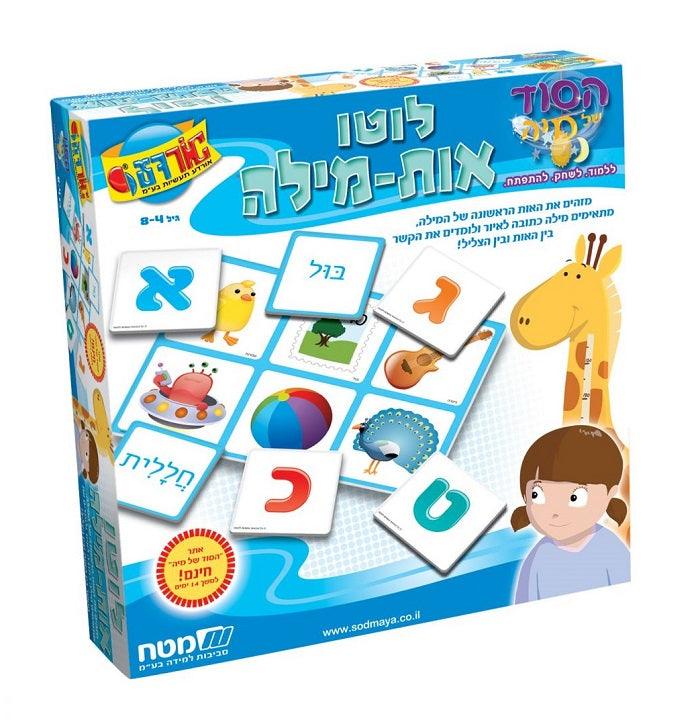 לוטו אות מילה מסדרת הסוד של מיה מבית אורדע. מזהים את האות הראשונה של המילה, מתאימים מילה כתובה לאיור ולומדים את הקשר בין האות ובין הצליל! במשחק זה הילד מפתח מיומנויות חשובות לתהליך הקריאה. לגילאי 4-8.