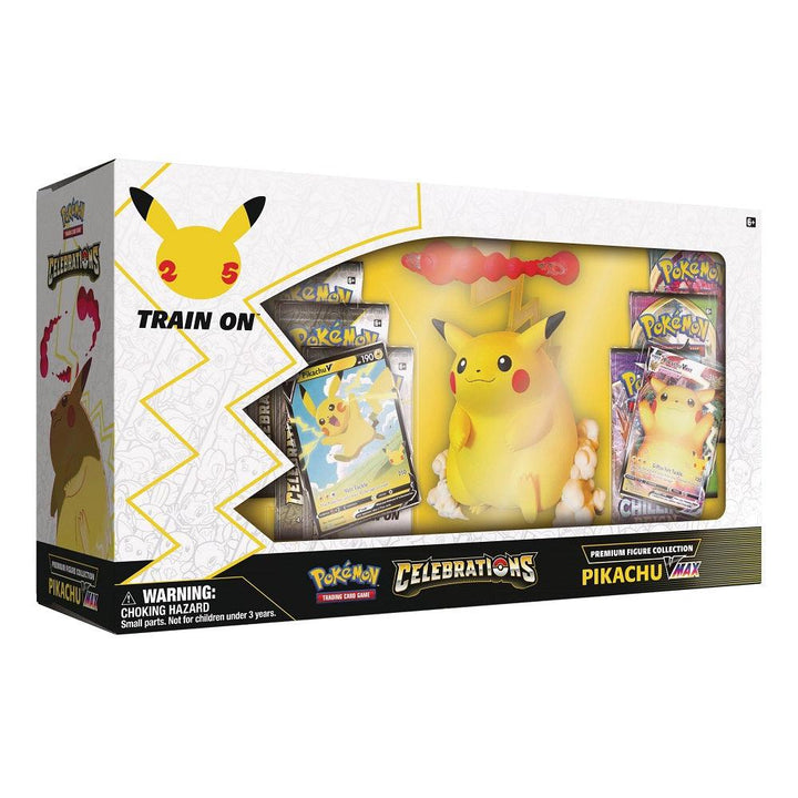 1 etched foil promo card featuring Pikachu VMAX, 1 foil promo card featuring Pikachu V, A supersize figure of Gigantamax Pikachu that makes a big impression, 8 Pokemon TCG: Celebrations 4-caard booster packs, 3 additional Pokemon TCG booster packs and a code for Pokemon Trading Card Game Online.