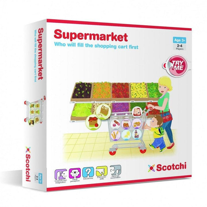 סקוצ'י סופרמרקט - עורכים וממיינים את המצרכים משחק התפתחותי לגיל הרך. חיזוק תיאום עין-יד. חיזוק המוטוריקה העדינה. חיזוק תפיסה חזותית. חיזוק היצירתיות והדמיון.