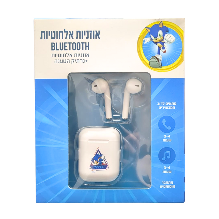 אוזניות אלחוטיות Bluetooth לילדים סוניק הקיפוד. מנגן 3-4 שעות. מתחבר אוטומטית. מתאים לרוב המכשירים. סטריאו טנלוגי. מרחק קליטה 10-15 מטר. זמן שיחה 3-4 שעות. זמן מוסיקה 3-4 שעות. זמן הטענה כ60 דקות. בלוטוס גרסה 5.0 מתאים לIOS ואנדרואיד. מודיע על שיחה נכנסת.