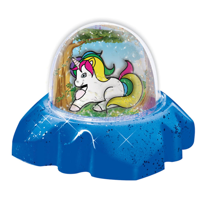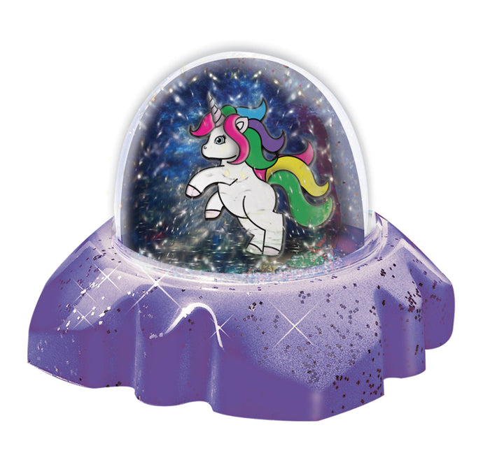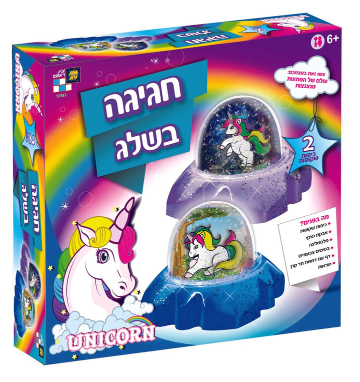 כיפות נוצצות חד קרןחגיגה בשלג חד קרן. עשו זאת בעצמכם. עולם של הפתעות מנצנצות. כולל 2 כיפות שקופותלגילאי 6 ומעלה.