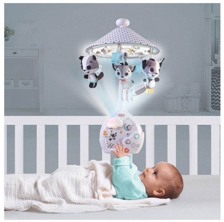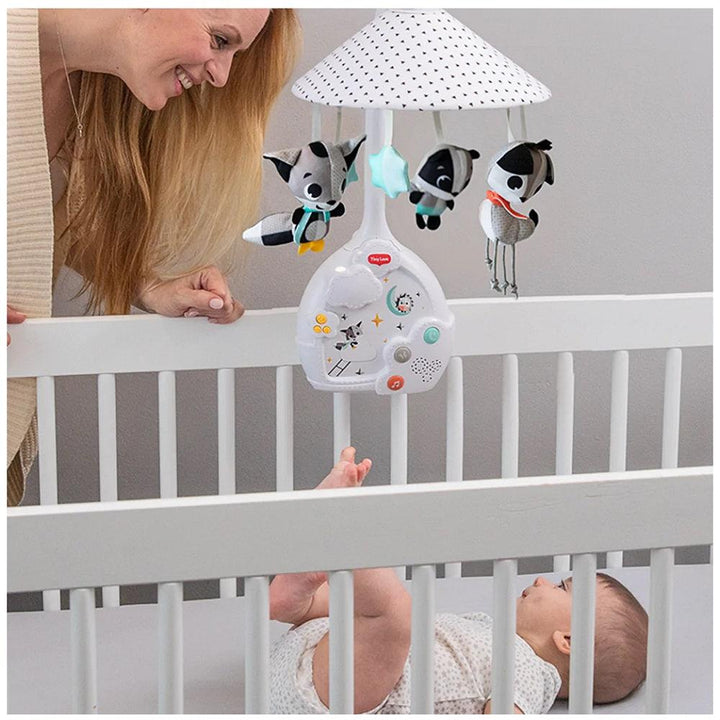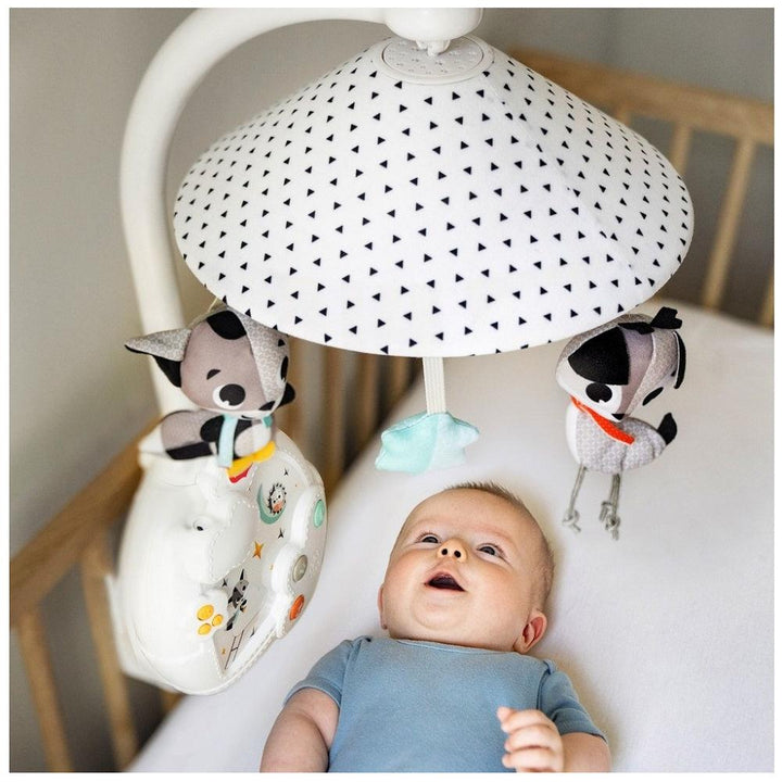 בחודשים הראשונים, מצב ההקרנה והעיצוב בשחור-לבן מציעים גירוי ויזואלי חיוני לתינוק, בעוד שהבחירה המוזיקלית מציעה גירוי שמיעתי. תן לתינוק לשכב בעריסה וליהנות מהחוויה החזותית והשמיעתית מעוררת ההשראה.