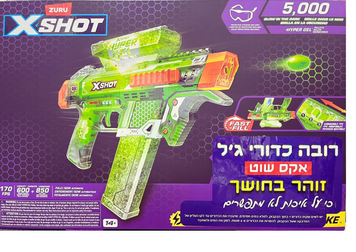 אקס שוט - רובה כדורי ג'ל אוטומטי זוהר בחושך מבית זורו Zuru - X Shot Hyper gel trace fire glow הכירו את אקס שוט רובה כדורי ג'ל אוטומטי מבית Zuru.רובה כדורי ג'ל אוטומטי שמביא את חווית המשחק לרמה הבאה.מספק דיוק מדהים.כדורי הג'ל זוהרים בחושך.מצויד במיכל תחמושת עצום המכיל עד 5,000...